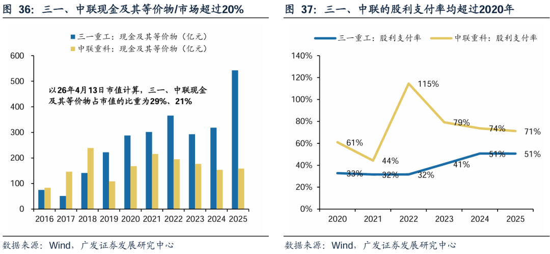(2) 现金及其等价物储备充裕,带来潜在分红和回购的空间。25年三一重工、中联重科的股息分派率分别为51%、71%;25年三一重工、中联重科现金及其等价物金额达到543、159亿元,占到企业价值(以4月13日收盘价市值做参照)的比重分别为29%、20%。