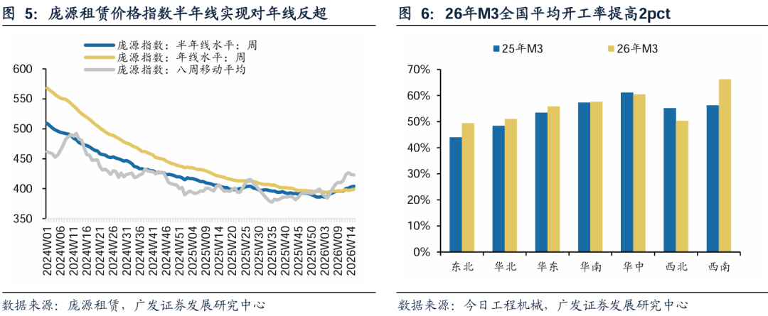 反映到工程机械上,3月越来越多的开工好转的迹象正逐步浮出水面。(1)CMI指数:根据今日工程机械数据,3月份CMI指数同比增速提高4.6个百分点,环比增速提高30.28个百分点,表明3月终端一线工程机械市场的销售热度,逐步开始启动,并有所升温,特别是南部和中部市场;(2)庞源塔机价格指数:用于衡量塔式起重机租赁的周度签单价格的变化,该指数在26年初首次出现半年线反超年线;(3)分地区开工率:26年3月份全球开工率整体提高2pct,其中西南地区大幅提升,这与挖机分省份销量基本吻合。