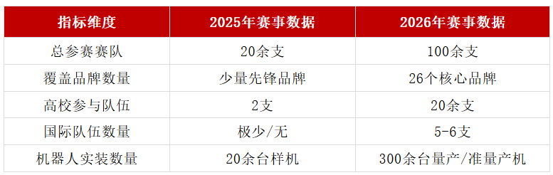 2026年机器人半马最直观的震撼来自于参赛规模的扩张。参赛队伍从上一年的20余支猛增至100余支,品牌涵盖了26个,机器人总数超过300台。这种跨越式的增长,不仅是数量上的堆叠,更是产业链广度与深度的质变。