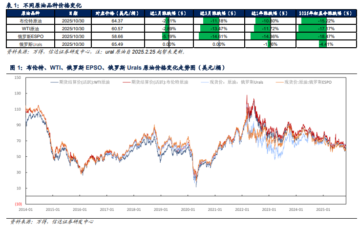 截至2025年10月30日,布伦特原油、WTI原油、俄罗斯EPSO原油、俄罗斯Urals原油价格分别为64.37、60.57、58.66、65.49美元/桶,近一个月主要油品涨跌幅分别为:布伦特原油(-2.51%)、WTI原油(-2.89%)、俄罗斯ESPO(-5.19%)、俄罗斯Urals( 0.00%)。2025年年初至2025年10月30日期间不同油品涨跌幅分别为:布伦特原油(-15.22%)、WTI原油(-17.17%)、俄罗斯ESPO(-18.47%)、俄罗斯Urals(-4.41%)。