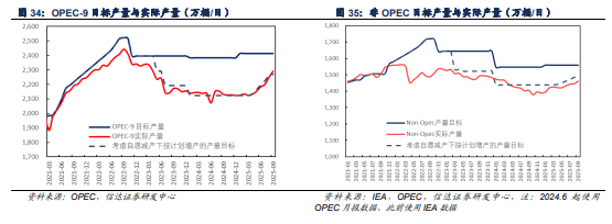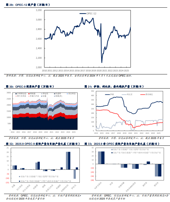 对于未参与减产的伊朗、利比亚和委内瑞拉,三个国家在2025年9月的原油产量分别为325.0、131.8、96.7万桶/日,环比 3.2、 1.9、 3.1万桶/日。