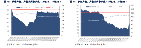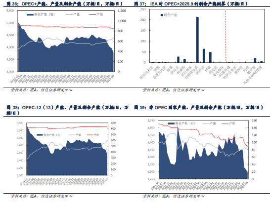 根据IEA 2025年10月报披露数据,2025年9月OPEC 合计剩余产能为372万桶/日,环比-89万桶/日。其中,OPEC-12国剩余产能为357万桶/日,主要集中在沙特、阿联酋,两国剩余产能分别为213、64万桶/日;非OPEC国家剩余产能为18万桶/日,主要集中在俄罗斯,其剩余产能为19万桶/日。