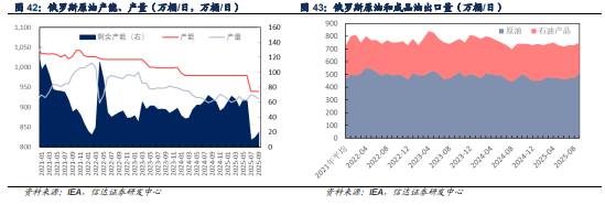 产量方面:2025年9月,俄罗斯原油产量为921万桶/日,环比-7万桶/日,原油剩余产能为19万桶/日,环比 7万桶/日。