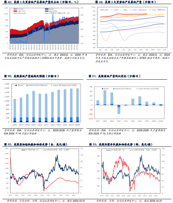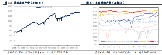EIA在2025年10月报中,预计2025-2026年全年美国原油产量平均分别为1352.42、1350.77万桶/日,同比 28.97、-1.65万桶/日。