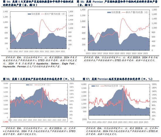 2025年9月,美国5大页岩油产区库存井(DUC)数量为2,968口,环比-8口,总完井率为104.86%,环比-0.9pct。其中,Permian地区库存井数量为956口,环比-21口,地区完井率为105.20%,环比 0.25pct。