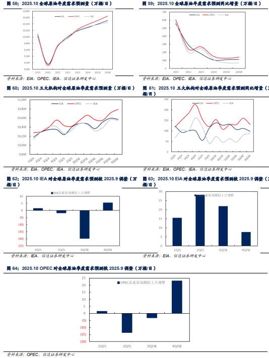 具体来看,2025年10月IEA、EIA、OPEC预测2025Q4全球原油需求或将分别同比 73.75、 138.31、 153.58万桶/日,相较2025年9月预测量分别 5.48、 7.70、 23.12万桶/日。