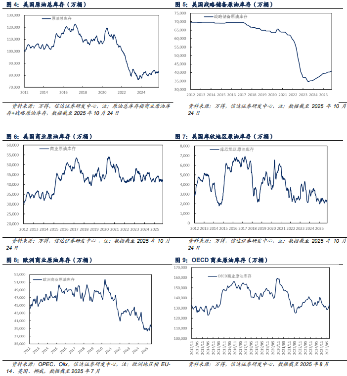 美国、欧洲、东南亚汽柴油库存均处于历史低位水平。截至2025年10月24日当周,美国原油总库存为8.25亿桶,较上周减少632.5万桶(-0.76%);战略原油库存为4.09亿桶,较上周增加53.3万桶( 0.13%);商业原油库存为4.16亿桶,较上周减少685.8万桶(-1.62%);库欣地区原油库存为2256.5万桶,较上周增加133.4万桶( 6.28%)。