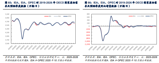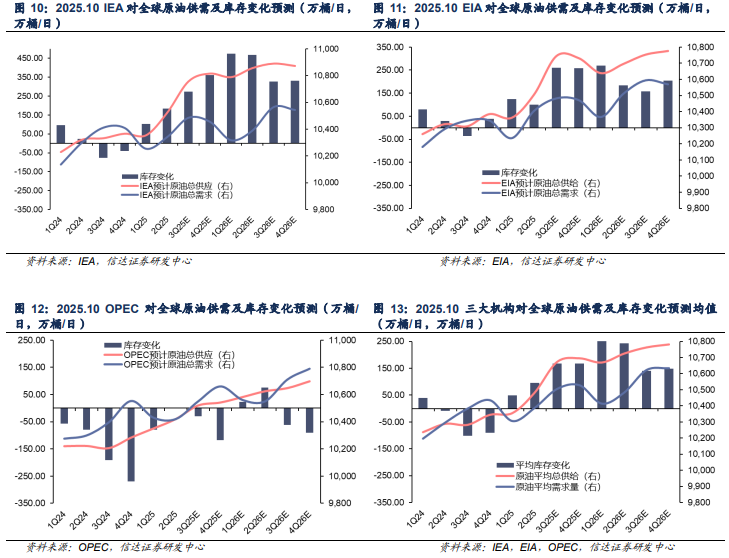 对于2025Q4,IEA、EIA和OPEC预测全球原油库存或将分别为 361.80、 258.48、-117.87万桶/日,三大机构预测库存变化平均为 167.47万桶/日,较2025年9月预测平均库存变化分别为 55.91、 37.60、-26.18万桶/日。