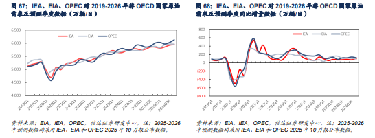 IEA、EIA和OPEC预计2025-2026年OECD国家原油需求保持平稳,但低于2019年疫情前水平。IEA、EIA和OPEC 2025年10月报预期,2025年OECD国家需求分别为4580.8、4575.6、4597.5万桶/日,较2024年分别-3.2、-8.4、 29.0万桶/日;IEA、EIA和OPEC预计2026年OECD国家需求分别为4569.0、4585.1、4612.5万桶/日,较2025年分别-11.7、 9.5、15.0万桶/日,与2019年疫情前水平仍有差距。