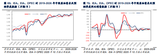 IEA、EIA和OPEC预计2025年中国需求增量放缓。IEA、EIA和OPEC 2025年10月报预期,2025年中国原油需求分别为1666.2、1656.5、1685.0万桶/日,较2024年分别增加7.2、25.5、19.5万桶/日,分别占非OECD国家总需求增量的9.81%、21.89%、19.63%。IEA、EIA和OPEC预计2026年中国原油需求分别为1679.6、1680.2、1702.5万桶/日,较2025年分别增加13.4、23.7、17.5万桶/日,分别占非OECD国家总需求增量的16.42%、23.11%、14.00%。