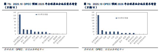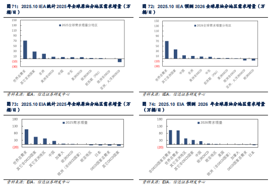 IEA、EIA和OPEC预计亚洲地区的非OECD国家为2025-2026年全球原油需求增量贡献主力。EIA、IEA和OPEC三机构在2025年10月预计2025-2026年亚洲及非洲和拉美地区非OECD国家原油需求将继续带动全球原油需求保持增长,OECD国家需求保持稳定。