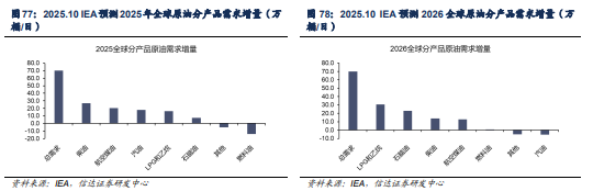 IEA预计2025年成品油需求恢复强劲,2026年化工用油为石油需求增量主要力量。根据IEA 2025年10月报, 2025年全球航空煤油、汽油、柴油需求较2024年分别 20.2、 18.0、 27.0万桶/日至772、2753、2875.3万桶/日,相较于9月报,IEA整体上调了2025年成品油需求;化工品板块,2025年全球LPG和乙烷、石脑油需求将分别较2024年 16.3、 7.6万桶/日至1520.1、728.9万桶/日。