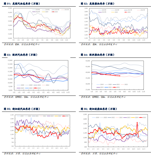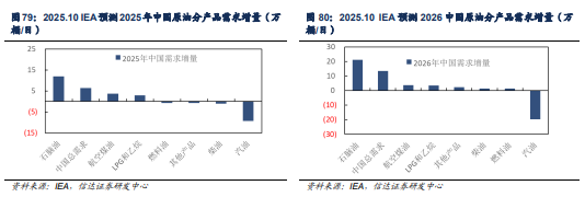 中国方面,IEA预计2025年中国原油需求增量同比改善,主要依赖石脑油和航空煤油拉动。IEA在2025年10月报中预计2025年中国柴油、汽油、航空煤油需求也将较2024年分别-1.1、-9.3、 3.6万桶/日至354.2、353.4、95.3万桶/日;化工品板块,预计2025年LPG和乙烷、石脑油需求分别将较2024年 2.80、 11.90万桶/日至268.2、240.4万桶/日。