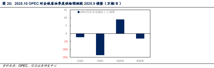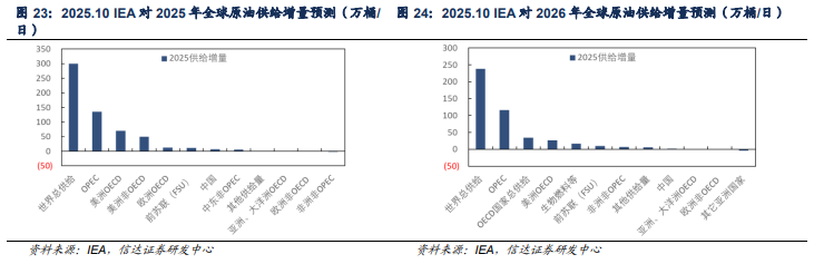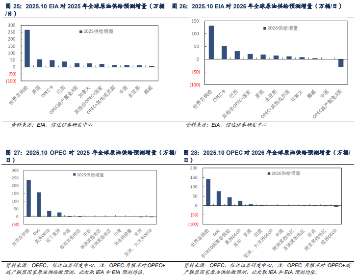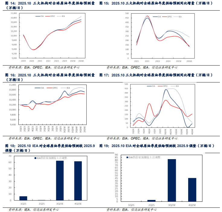 具体来看,2025年10月IEA、EIA、OPEC预测2025Q4全球原油供给同比增量分别 448.13、 346.33、 259.36万桶/日,相较2025年9月预测变化分别 61.39、 45.30、-3.06万桶/日。