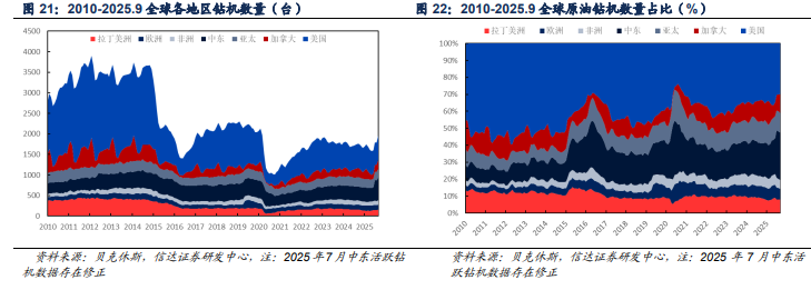 2025年9月,全球活跃钻机总数为1960台,较2025年8月增加167台,其中加拿大217台( 38台)、亚太226台( 14台)、中东546台( 45台)、拉美157台( 14台)、美国587台( 49台)、非洲106台( 7台)、欧洲121台(持平)。