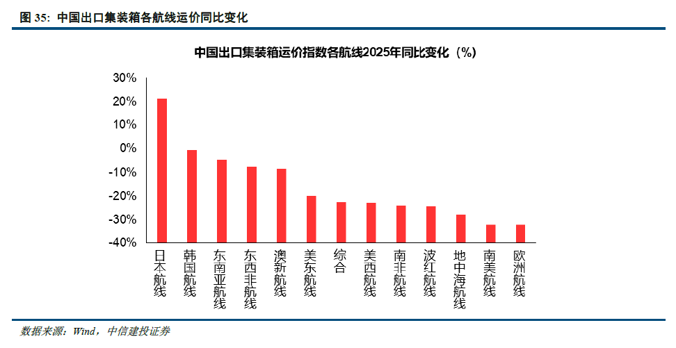 受制于美国库存周期转向,全球贸易至美国流向增速放缓,2025年1-10月份,亚洲至美国集装箱贸易量增速出现负增长。而亚洲至非洲、南美、印巴中东、欧洲等区域增速实现了更快增长,有效地对冲了美国相关航线的下滑。从运价上来看,由于去年同期基数与贸易流改变的影响,日本航线仍然要高于去年同期,东南亚、东西非、澳洲航线运价相比去年同期下跌幅度较小,欧地线由于去年红海危机影响,运价相比去年极高运价出现了大幅下降。但整体上来看,船公司在2025年仍然取得了较市场预期更好的盈利水平。