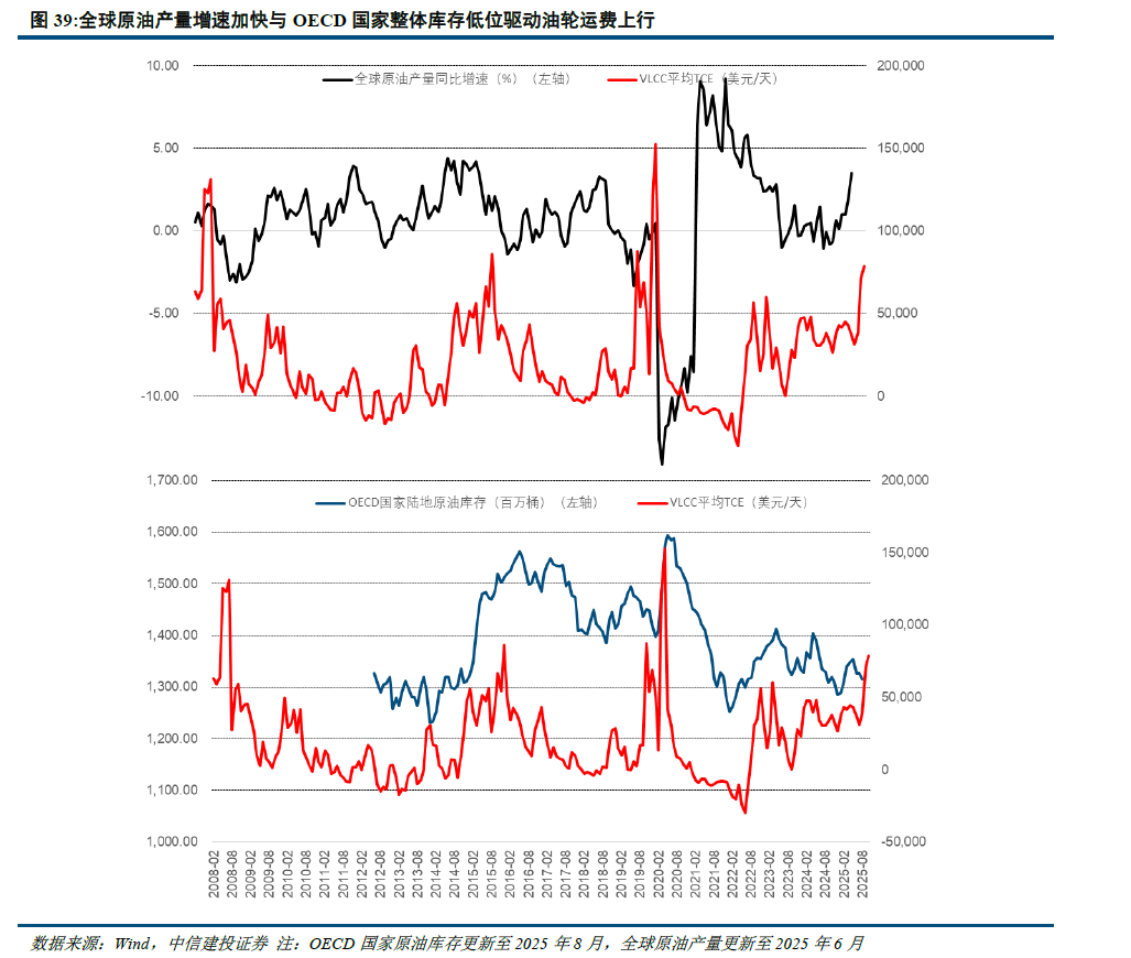 俄乌冲突改变了全球原油供应格局。由于俄油的约束,欧盟等国家大大减少对俄油的依赖,俄油转而向亚洲区域供给。同时,美国、巴西等其他产油国都在扩大产量,部分非洲国家退出OPEC组织,导致OPEC份额在逐步减少,反而给其他国家留下了增产的市场空间。步入2025年,OPEC改变了以往减产策略,转向增产,并进入到实质增产阶段。虽然增产未必代表着海运原油出口量的增加,但是从8月份以来观察到的实际海运贸易量数据确实增加,有效推动了原油油轮运费的大幅度上行。