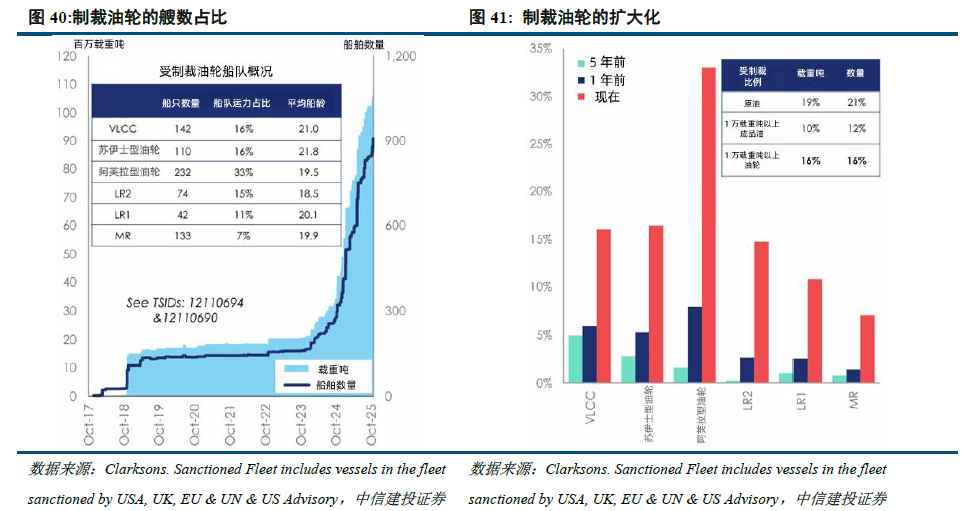 由于欧美对于影子船队的扩大制裁,特别是自2025年年初以来,美国加大了对影子船队的制裁,导致市场上有效运力缩减,推升了运价中枢,也提高了运价在旺季的弹性。目前VLCC中有约16%船队属于受限船,特别是与俄罗斯紧密相关的阿芙拉型船占比已经达到33%。