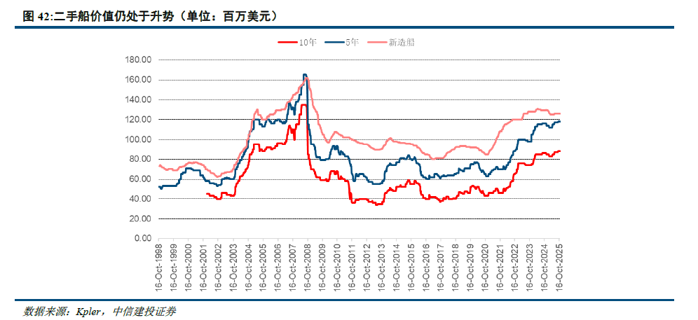 虽然新造船的价格近期有些回落,但是整体二手船的交易价值仍在上涨,这与最近的租金大幅度上涨有一定关系。假设一艘10年船龄的船,在2015年新造船的价格约为9500万美金,按照20年折旧计算,不考虑残值,目前账面价值为4750万美金,但市场价值达到了8800万美金,增值率达到85%。