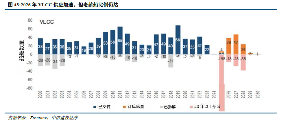 若无大量新船订单,油运行业大周期或延续至 2029-2031 年。供给支撑强劲,船厂产能萎缩、劳动力短缺形成产能瓶颈;VLCC 船队老化、新船订单少致运力断层;影子船队难入主流市场,运距拉长、运力闲置进一步消耗有效运力。
