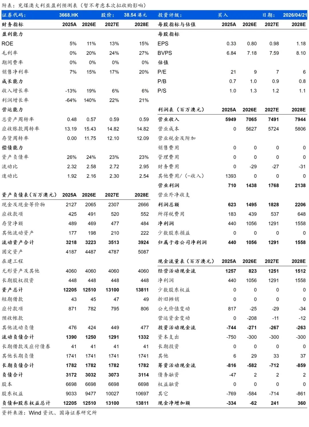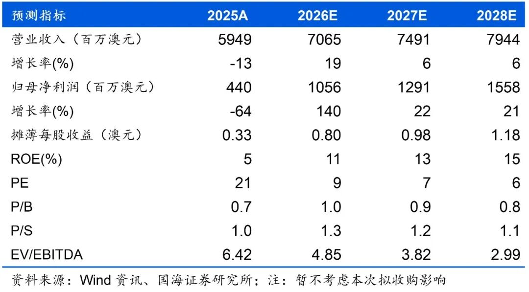 盈利预测与投资评级:基于审慎原则,暂不考虑拟收购红隼煤矿影响,我们预计公司2026-2028年营业收入分别为70.65/74.91/79.44亿澳元,同比 19%/ 6%/ 6%,归母净利润分别为10.56/12.91/15.58亿澳元,同比 140%/ 22%/ 21%;EPS分别为0.8/0.98/1.18澳元,对应当前股价PE为9/7/6倍。考虑公司量端有增长动能,且充分受益海外煤价上涨,首次覆盖,给予“买入”评级。