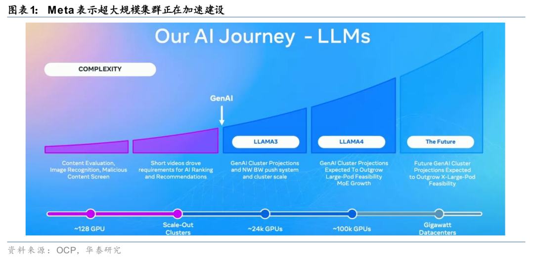 大集群建设驱动AI算力产业链景气度持续提升。随着全球科技大厂继续加码对AI算力的投入,大规模GPU集群作为本轮生成式AI算力基建的核心形态,其建设步伐仍在快速推进。例如博通在2025年6月业绩会中重申,预计至少三家客户将在2027年部署百万卡集群;Marvell在2025年6月的投资者日中亦强调,客户的百万卡集群正在加速建设;Meta在2025年10月OCP的演讲中提到,正在规划未来数个GW级别的超大集群。我们判断大集群的建设将持续驱动GPU、光模块、交换机等算力硬件需求的快速释放。