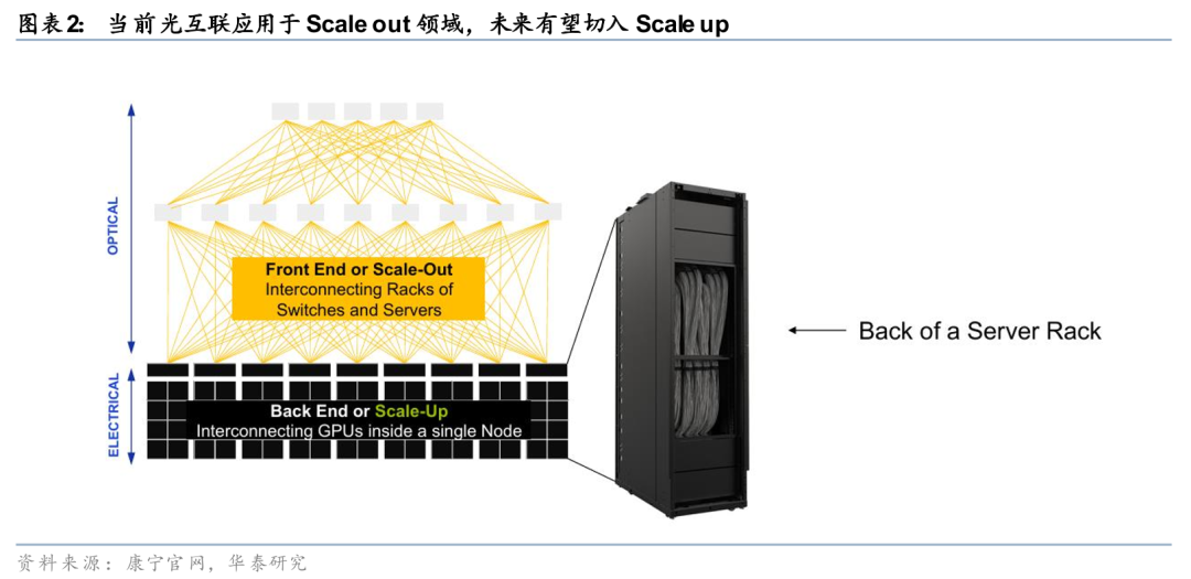 光互联:大集群核心拼图,长期成长空间广阔。目前光互联基于长距离传输等优势,已广泛应用于大集群的Scale out网络,即跨机柜、大规模互联场景;长期来看,我们认为光通信有望向Scale up网络渗透,即机柜内部的互联场景。当前Scale up网络由于互联距离较短、互联规模有限,仍可继续使用铜连接技术;而未来随着信号传输速率的进一步提升、Scale up域的进一步扩展至多机柜,光互联优势有望逐步显现,从而获得渗透率提升机遇。我们认为长期来看,随着光互联向Scale up的渗透,光通信在AI基础设施投资中的价值量占比有望进一步提升。