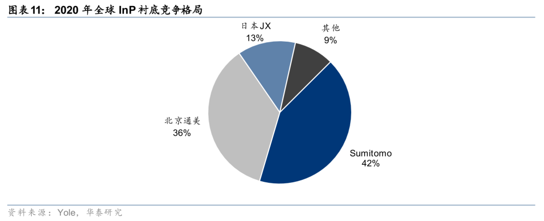 市场格局:根据Yole的统计,InP衬底材料市场头部企业集中度较高,2020年CR3约90%。InP衬底的制造包含多晶合成(可外购)、单晶生长、切割、研磨、抛光、清洗、测试等多个环节,工艺环节复杂,技术门槛较高;同时,InP衬底逐步向更大尺寸迭代,对企业的设备、工艺、技术积累要求较高,进一步提升行业准入门槛。据Yole数据,2020年全球前三大厂商占据InP衬底市场 90%以上市场份额,其中Sumitomo(日本住友)为全球第一大厂商,占比为42%;北京通美位居第二,占比36%;日本JX位居第三,占比13%。