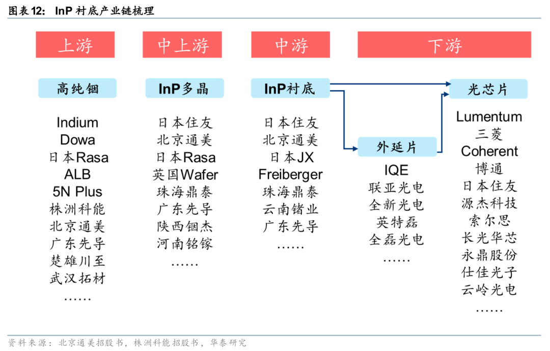 InP衬底的上游核心原材料之一主要为InP多晶,根据北京通美招股书,由于自然界中不存在天然的InP多晶,因此需要将高纯铟、红磷等原料通过人工合成制备为InP多晶;InP衬底厂商基于InP多晶等原材料进行InP单晶的生长,再经过切割、磨边、研磨、抛光、清洗等多道工艺后真空封装成衬底,其中InP单晶的生长是衬底厂商的核心工艺;InP衬底的下游客户群体主要包括外延片厂商(将衬底制备为外延片后,再销售给光芯片厂商),或直接销售给光芯片厂商,其中外延片环节的代表厂商包括联亚光电、IQE等。