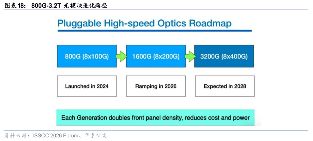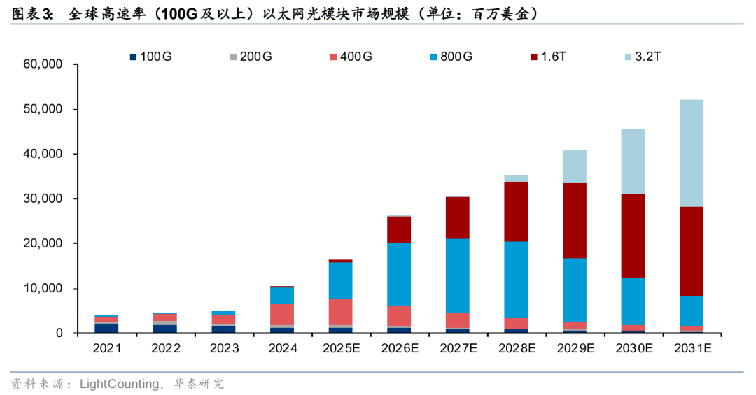 AI算力持续迭代,3.2T光模块有望加速导入。随着GPU/ASIC的持续迭代升级,数据中心光模块已实现从400G到800G再到1.6T的演进,根据LightCounting于2026年1月发布的《Optics for AI Clusters》报告,2026年全球以太网光模块市场规模有望达260.84亿美金,其中800G光模块占比为53.85%,1.6T占比达22.60%,二者合计渗透率较2023年提升53.67pct;在此趋势下,3.2T光模块也有望迎来加速导入,LightCounting预计2028年3.2T光模块市场规模有望达13.96亿美金,2031年有望提升至240亿美金。