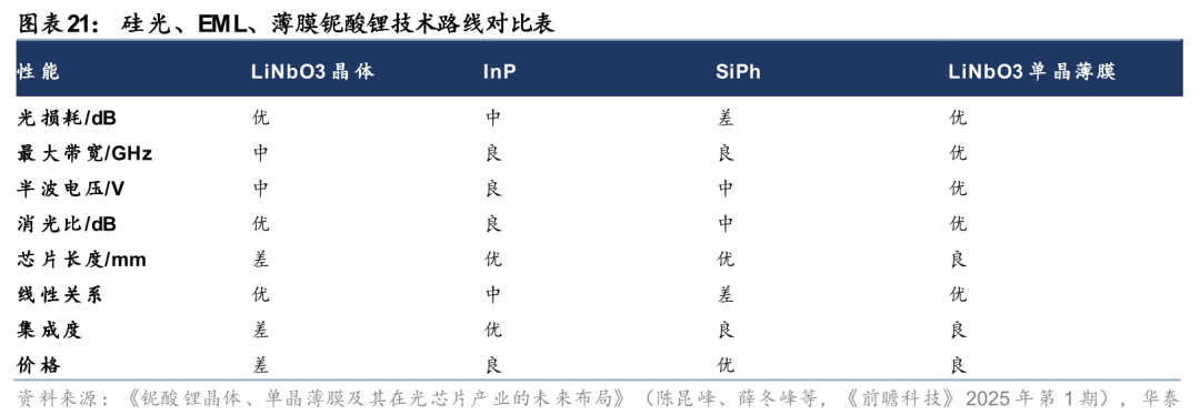 相比于硅光路线,薄膜铌酸锂具备显著的超高带宽、低功耗、低损耗特性。根据论文《铌酸锂晶体、单晶薄膜及其在光芯片产业的未来布局》(陈昆峰、薛冬峰等,《前瞻科技》2025年第1期),铌酸锂调制器以其高速率、低功耗、高信噪比等优点,广泛应用于超高速干线光通信网、海底光通信网、城域核心网等领域。大尺寸光刻技术、超低损耗波导加工工艺和异质集成等关键技术,推动了薄膜铌酸锂调制器的发展,使其得以支持1.6T和3.2T高速光模块应用。相比磷化铟、硅光和传统的铌酸锂等材料,薄膜铌酸锂具备超高带宽、低功耗、低损耗、小尺寸,以及可实现晶圆级大批量生产等突出特点,有望以更优路径实现单波400G的调制,从而迎来导入机遇。