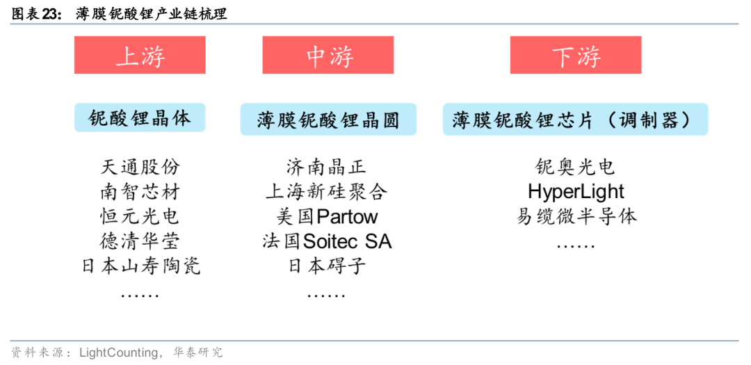 InP衬底:【高纯铟】、【多晶合成】、【InP衬底】相关公司。薄膜铌酸锂:【铌酸锂晶体材料】、【薄膜铌酸锂晶圆】、【薄膜铌酸锂调制器(芯片)】相关公司。具体公司梳理,请见研报原文。