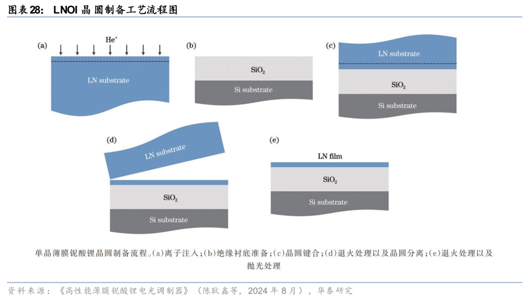 国内龙头厂商领跑,率先实现产业化量产。根据论文《铌酸锂晶体、单晶薄膜及其在光芯片产业的未来布局》(陈昆峰、薛冬峰等,《前瞻科技》2025年第1期),济南晶正为国内薄膜铌酸锂晶圆的领先企业,是全球少有的实现4-8英寸全尺寸、声学级 光学级全品类覆盖的厂商,可实现300-900nm薄膜厚度的精准可控,核心产品在厚度均匀性、缺陷抑制、光学损耗等关键指标上均处于全球顶尖水平,也是业内首家实现8英寸X轴光学级铌酸锂薄膜量产的企业,支撑了全球90%以上的铌酸锂薄膜器件研发与产业化落地,技术壁垒与产业地位较高。国内厂商上海新硅聚合已实现4-6英寸产品布局,进一步完善了国内LNOI产业链的供给梯队。