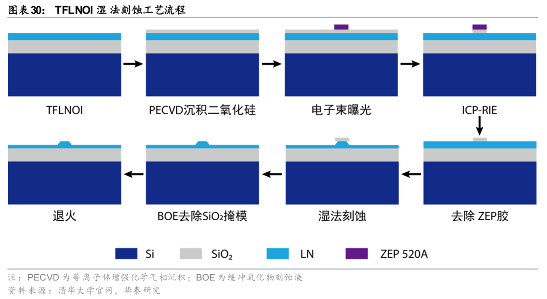 薄膜铌酸锂产业链从上游到下游可大致划分为:铌酸锂材料晶体→薄膜铌酸锂晶圆→薄膜铌酸锂芯片(调制器)→终端的光模块厂商。其中光学级铌酸锂单晶的制取是产业链的最上游环节,此前该市场长期被日本厂商垄断,目前国内的天通股份、南智芯材等厂商已实现国产化突破;薄膜铌酸锂晶圆核心工艺是在硅材料的衬底上进行键合等,国内头部厂商包括济南晶正、上海新硅聚合等;薄膜铌酸锂调制芯片厂商则通过光刻、物理轰击刻蚀或化学机械抛光工艺,制备TFLN芯片,全球代表厂商包括江苏铌奥光电、Hyperlight等。