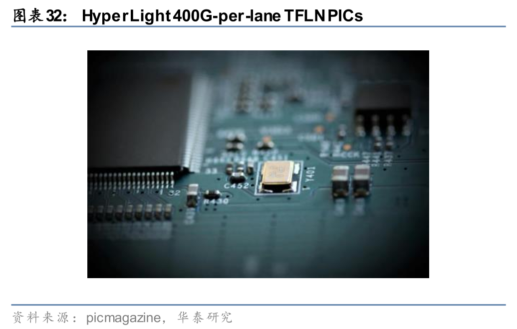 单波400G调制器判断:薄膜铌酸锂有望迎来导入。3.2T光模块中单通道光信号调制速率需达到400G,对调制器的性能要求进一步提升。根据《美国商业资讯》于2026年3月的报道,HyperLight首席执行官张勉表示:“单通道400G是TFLN优势显现的一个典型例子。虽然从带宽的角度来看,单通道400G将许多技术推向了极限,但TFLN提供了充足的带宽裕度,同时保持了低驱动电压。这不仅实现了出色的可制造性,还显著降低了模块功耗。”我们判断薄膜铌酸锂相比于纯硅光调制器具备超高带宽、低功耗、低损耗等优势,有望以更低功耗的方式实现单波400G的调制,从而在3.2T时代迎来导入机遇。