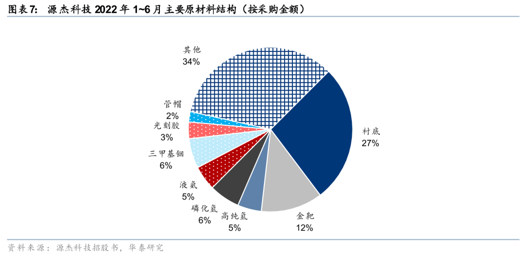 衬底是光芯片厂商的核心原材料,在BOM中占比较高。据国内光芯片龙头厂商源杰科技招股说明书中披露的数据,公司2022年1~6月的主要原材料采购中,衬底的采购金额占比为27.21%,是BOM中最大的单一品类。其次包括金靶、特殊气体(主要包括高纯氢、磷化氢、液氮等)、三甲基铟、光刻胶、封装材料(包括管帽等)等。