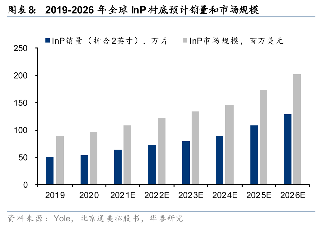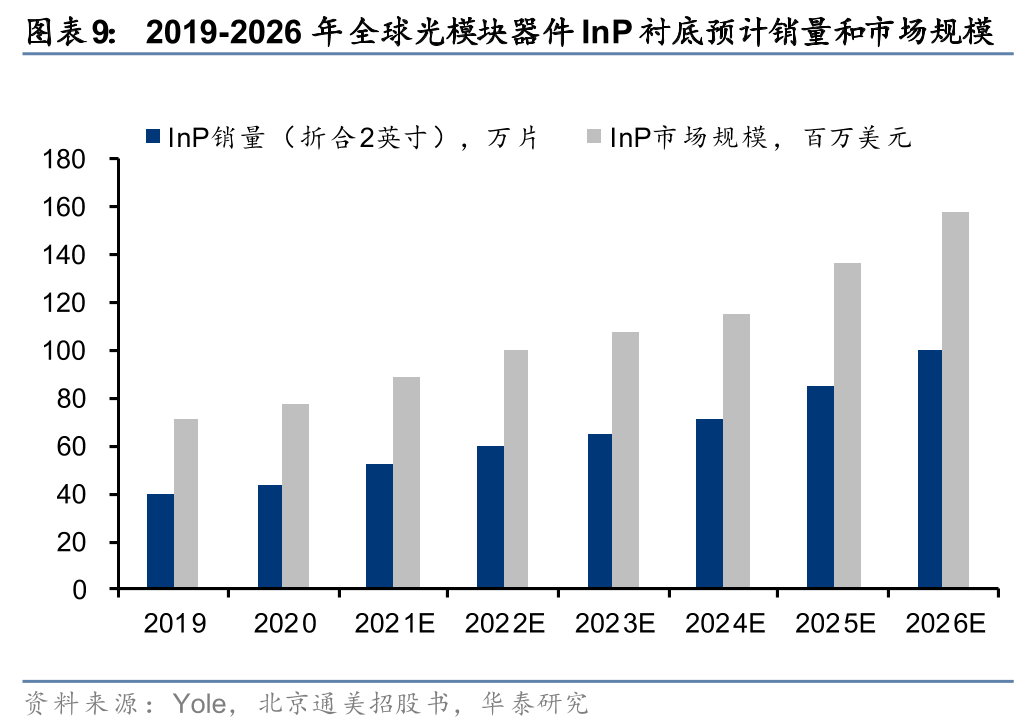 市场规模:2026年全球InP市场规模有望达到2.02亿美元,下游应用以光模块为核心。根据北京通美招股书引用Yole的预测,全球InP衬底销量(折合为2英寸)将从2019年的49.9万片增加至2026年的128.1万片,对应2020-2026年CAGR为14.42%;全球InP衬底市场规模将从2019年的0.89亿美元增长至2026年的2.02亿美元,2020-2026年CAGR为12.42%。