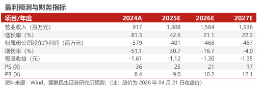 公司部署AI算力到应用全产业链,多项平台技术优势明显。此外,公司多方向开拓AI市场,通过企业级、消费级、行业级三方向渠道开拓,销售额增长显著。后续随着自研芯片及相关产品在云端推理市场,公司营收有望迎来快速增长。我们预计公司2025-2027年营业收入为13.08、15.84、19.36亿元,对应PS分别为25X、21X、17X,维持“推荐”评级。