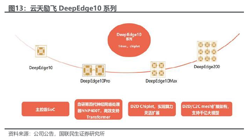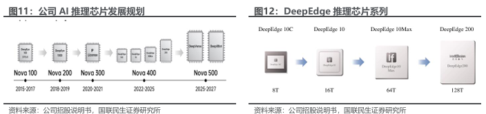 多代AI推理芯片持续发展,算力水平持续提升。公司推理芯片目前已更新至第四代,DeepEdge系列对应Nova 400,采用算力积木设计,融合D2D chiplet和C2C mesh tour互连技术。DeepEdge10系列可支持单个芯片8T至128T的算力需求。