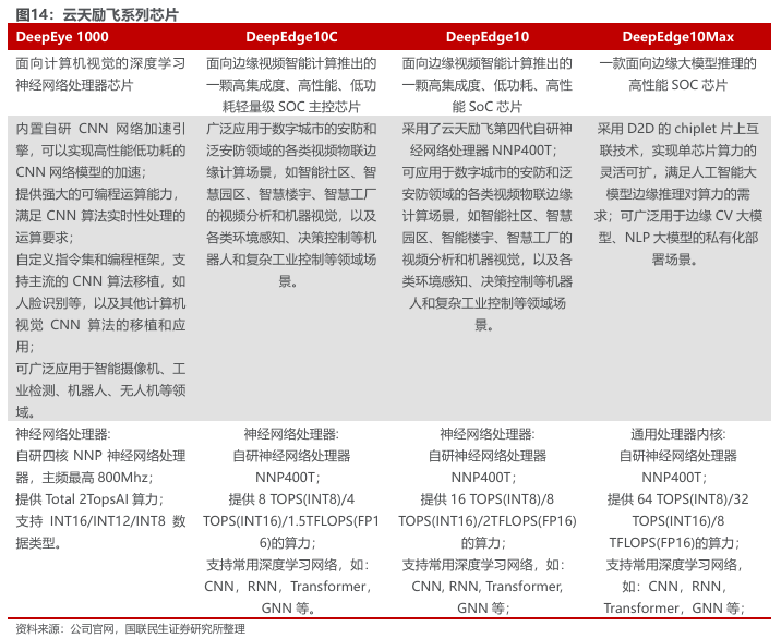 面对不同场景需求,推出不同系列产品覆盖全场景需求。DeepEdge10系列使用公司自研神经网络处理器NNP400T,提供自8T-128T的算力,其中 DeepEdge10C、DeepEdge10、DeepEdge10max、DeepEdge200为面向边缘视频智能计算和边缘大模型推理推出的高集成度、高性能、低功耗轻量级SOC主控芯片,DeepEdge200为面向云端大模型推理的高性能SOC芯片,采用D2D的chiplet片上互联技术,实现单芯片算力的灵活可扩,满足人工智能大模型云端推理对算力的需求。