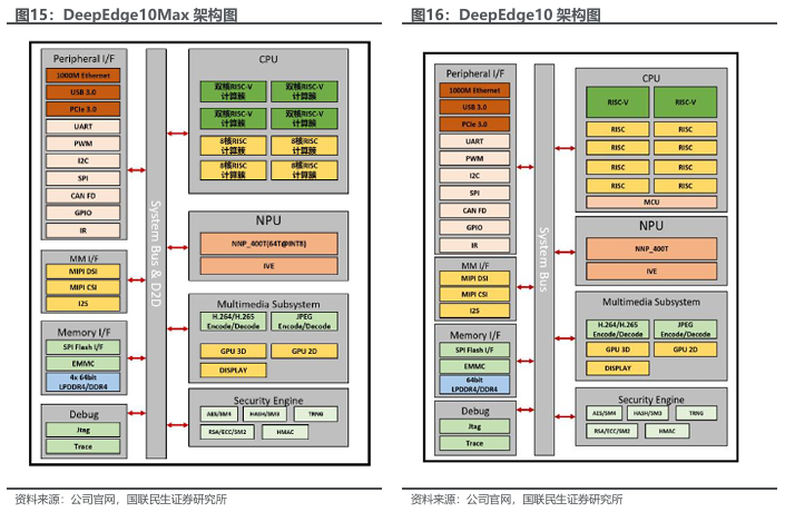 公司自研芯片结构助力多场景应用落地。DeepEdge10Max搭载了4个八核64位RISC通用处理器计算簇,4个双核64位RISC-V处理器计算簇,支持RV64GCV指令集,支持256-bit数据位宽。DeepEdge10搭载了八核64位RISC通用处理器,双核64位RISC-V 处理器,支持RV64GCV 指令集,支持64-bit 数据位宽。