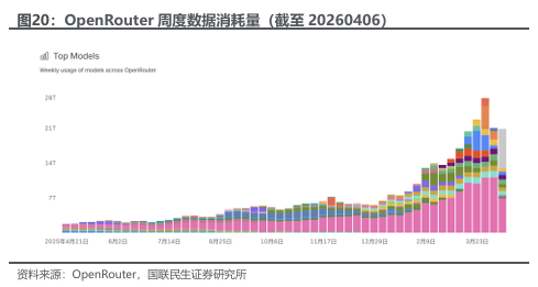 AI应用带动token消耗量快速提升,模型厂商出现涨价、限量限时现象,进一步带动算力需求提升。根据OpenRouter数据,从年度变化上看,2025年4月21这周的周度模型数据使用量为1.76T,截至2026年4月6日的最新数据,周度模型数据使用量为21T,相较一年前增长了近12倍。在OpenClaw以及各种Agent应用的使用程度提升的背景下,模型tokens消耗量快速提升,部分模型厂商出现涨价、限量限时的现象。Tokens消耗量的快速提升进一步带动了算力需求度的提升。
