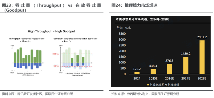 PD分离成为行业趋势,推理算力市场快速增长,公司产品竞争优势明显。PD分离架构是一种大型语言模型推理优化技术架构,由AMD在ROCm博客中提出。该架构将LLM推理的Prefill(预填充)与Decode(解码)两个阶段分离并分布在不同GPU上执行,以优化资源利用。prefill 阶段需要并行处理整个输入序列来生成首个 token,属于计算密集型操作。decode 阶段则逐个生成后续 token,需要频繁访问 KV cache,属于内存密集型操作。传统的 continuous batching 将两个阶段混合处理,导致相互干扰,难以同时满足 TTFT(首 token 延迟)和 TPOT(token 间延迟)的严格要求。为了解决这一问题,PD 分离架构应运而生,通过将 prefill 和 decode 分配到不同的 GPU 实例上,针对各自特性进行专门优化。这种分离式设计不仅消除了阶段间的干扰,还能显著提升系统的有效吞吐量(Goodput),为大规模 LLM 服务提供了更优的解决方案。避免了在同片GPU上因数据资源等待,导致较差的反应服务体验。因此在推理阶段,PD分离逐步成为行业的主要发展趋势之一。