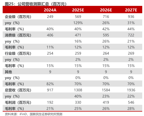 企业级:1)收入:公司企业级产品以推理芯片为核心,拓展系列产品,同时凭借算力储备提供算力支持与运维服务。公司该项业务营收为算力服务业务营收叠加以芯片为核心的相关的推理卡、边缘计算盒子、一体机等产品。公司算力服务业务营收规模较大,并于2024年下半年计入收入,2025年全年计入收入,因此预计2025年企业级业务增速提升较快,后续增速放缓。我们预计公司企业级营业收入2025-2027年增速分别为129%、26%、31%。2)毛利率:考虑到公司核心芯片产品加速卡推出,加速卡为高毛利率产品,相关产品起量有望带动毛利率提升,预计2025-2027年毛利率分别为40%、42%、44%。
