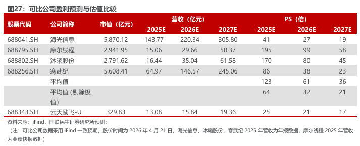 云天励飞主营业务涵盖AI推理芯片设计及AI软硬件产品销售,属于典型的Fabless芯片设计模式 。我们综合考虑业务形态、商业模式及行业属性,选取在AI芯片设计领域与公司业务相近的同类企业作为可比对象,具体包括:海光信息(国产CPU DCU双芯企业)、摩尔线程(国产高性能GPU厂商)、沐曦股份(国产高性能GPU企业)、寒武纪(国产AI芯片先行者)。可比公司2025-2027年平均PS分别为123X、61X,36X,云天励飞对应PS分别为25X、21X、17X。鉴于摩尔线程、沐曦股份两家公司目前均处于高投入亏损期,且享有高估值溢价,出于审慎考虑,剔除上述极值后2025-2027年平均PS分别为64X、32X、21X。横向对比来看,公司未来三年PS均显著低于可比公司均值水平,建议持续关注公司大算力推理芯片战略推进及商业化落地进展。