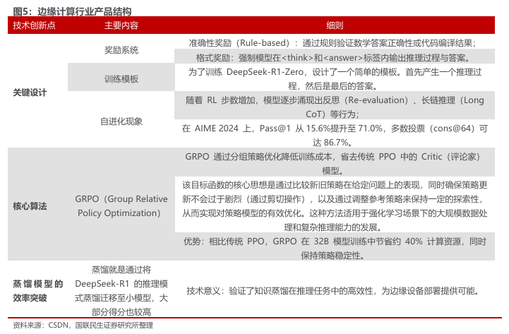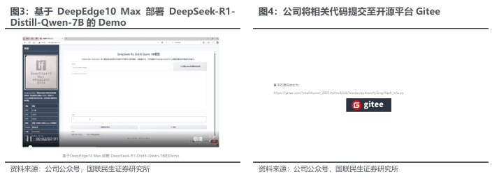 Deepseek开源模型,推动“算法-芯片协同进化”,公司核心设计理念高度相似。Deepseek开源推理模型R1引起产业变革,低成本高效能的模型开源,推动了行业的整体发展。由于硬件GPU使用受限,Deepseek采用软件端技术创新提升训练效率,整体训练成本约为550万美元,仅为OpenAI o1开发费用的3%。Deepseek R1通过关键设计的奖励系统、训练模板、自进化现象,以及用于强化学习的核心算法GRPO,用低算力的GPU训练出了媲美OpenAI o1的模型,证实了在AI行业中,软件端算法的创新可弥补硬件端差异,也可推动行业整体发展并产生经济效应。云天励飞持续强调的算法芯片化,通过自定义指令集、处理器架构及工具链的协同设计,通过软件端的改良提升芯片能力,从而拓展推理应用市场。