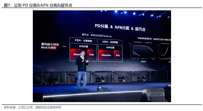 公司在芯片微架构层面针对 Attention 及 AFN 等计算特点进行细粒度分析,并在底层实现针对性优化。在一个包含 1024 颗芯片的超节点内,P 芯片与 D 芯片可实现有效组合,以满足大模型云推理的集群化部署需求。