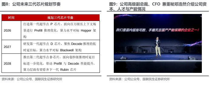 规划未来三代芯片,手握充足产能保障产品推出。公司未来三年规划了三代芯片产品:2026年,打造第一代超节点 P 芯片,面向百万级长上下文场景进行 Prefill推理优化,算力水平对标Hopper架构;2027年,研发第一代超节点 D 芯片,聚焦Decode推理的低时延目标,算力水平对标Blackwell架构;2028年,推出第二代超节点D芯片,面向毫秒级推理时延目标进一步优化,带动Prefill与Decode性能提升,算力层面有望看齐下一代Rubin芯片。