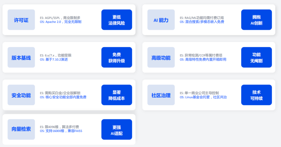 一方面,开源搜索生态发生变化。ElasticSearch作为广泛使用的企业级搜索与分析基础引擎,多应用于全文检索与数据分析等场景。但由于ElasticSearch调整了许可证策略(SSPL),企业在商业使用中的合规性与成本问题日益凸显,市场对于更加开放、可持续的技术体系需求不断增强。 另一方面,AI应用的快速发展,对搜索能力提出了更高要求。以向量检索、RAG(检索增强生成)为代表的AI应用快速发展,企业对“语义理解 知识检索”的能力需求显著提升,搜索系统正从信息获取工具转变为AI应用的关键基础设施。