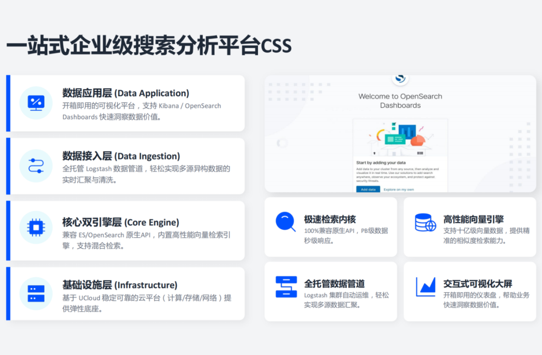 基于这一趋势,优刻得正式发布云搜索服务CSS(Cloud Search Service),引入OpenSearch引擎,打造企业级AI搜索平台。